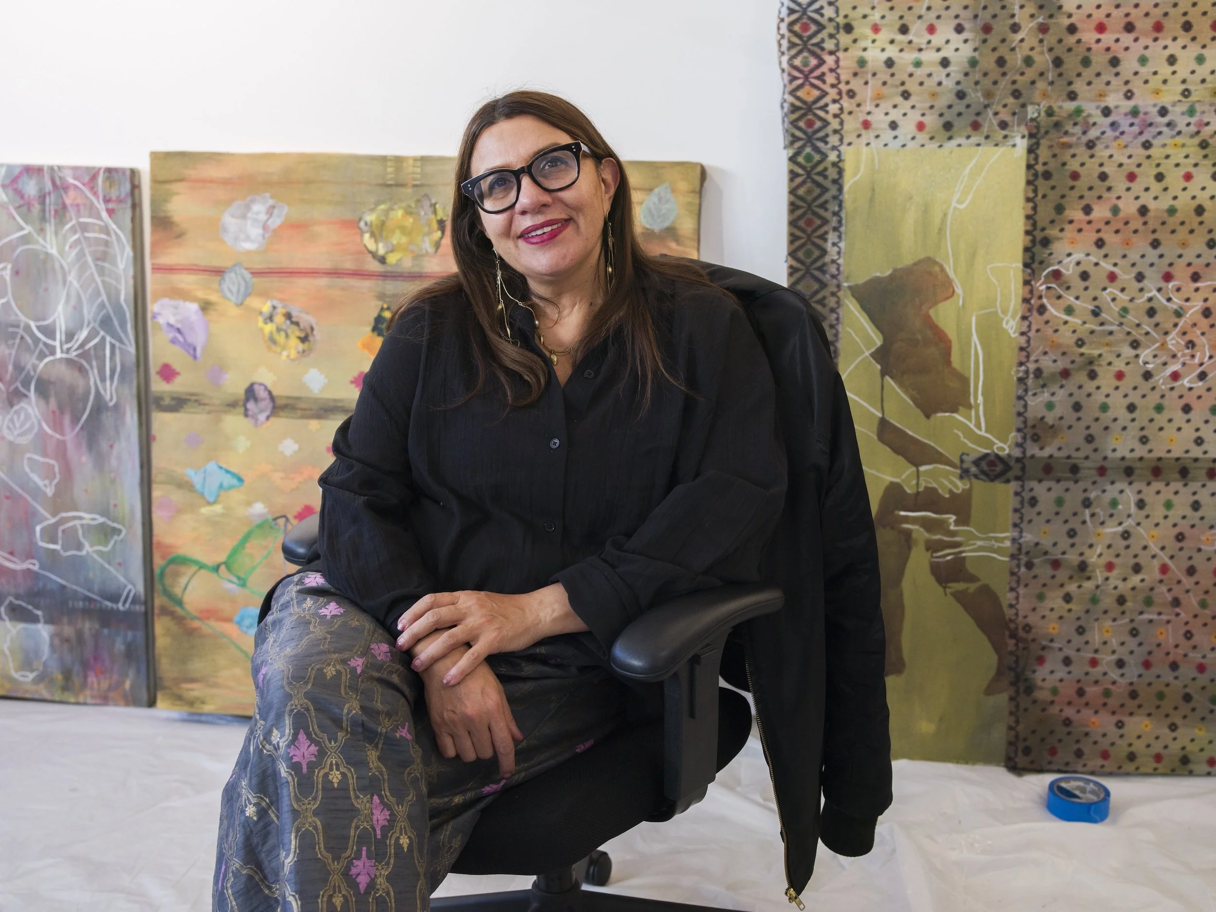 Ranu Mukherjee (b. 1966, Boston) makes hybrid work in painting, film installation and performance, marked by colliding tempos, saturated color and sensual materiality. Composed with Indian textiles, print and pigment, or animation and choreography, her densely layered works are tuned to a multidimensional sense of time, ecology and futurity. She draws on histories of collage, feminist speculative fiction, plant biology, diaspora, mythology, and ruptured colonial legacies. Mukherjee’s extensive exhibition history includes projects at the 18th Street Arts Center, Santa Monica; de Young Museum; Asian Art Museum, San Francisco; San Jose Museum of Art; Singapore Biennale 2022: Natasha; and the Karachi Biennial (2019). Gallery Wendi Norris published her first monograph, Shadowtime, in 2021. Recent honors include an Artadia Award (2023), a Pollock Krasner Grant (2020) and a Lucas Visual Arts Fellowship (2019-24). Mukherjee’s work is held in the permanent collections of the Asian Art Museum, San Francisco; de Young Museum; Chapman University; JP Morgan Chase Collection; Kadist Foundation; Oakland Museum of California; San Jose Museum of Art; and San Francisco Arts Commission, among others. She is co-creator of 0rphan Drift, an artist avatar making combined media works since their formation in London in 1994. Mukherjee is currently lives in Los Angeles and is currently dean of the School of Film and Video at CalArts.